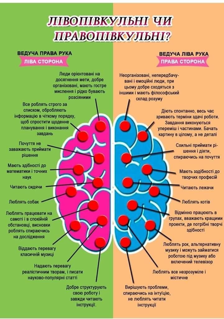 За способом мислення й обробки інформації всі люди поділяються на правопівкульних і лівопівкульних. Тобто в кожного з нас домінує ліва або права півкуля мозку. Виявивши, яка півкуля домінує саме у вас, можна стати більш ефективними та більш продуктивно навчатися та працювати.